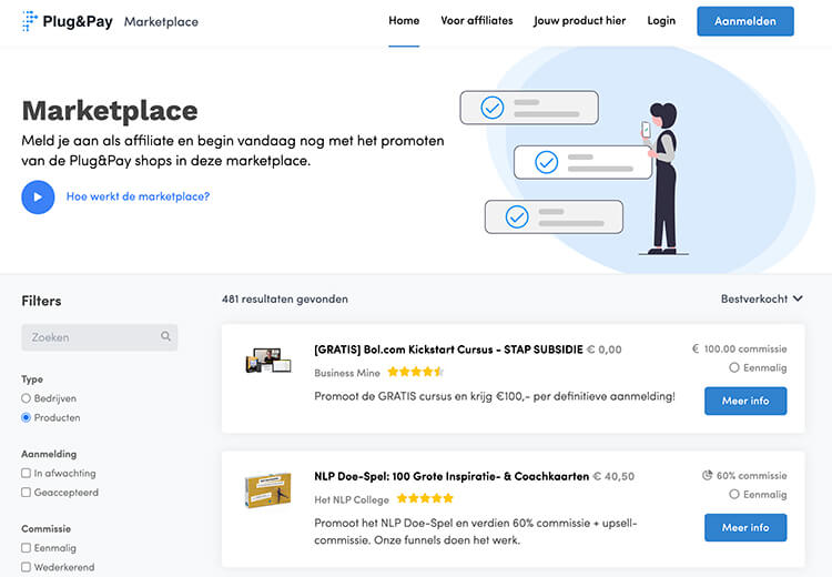 Plug&Pay is een tool van onze vrienden van IMU. Net zoals PayPro zijn zij een affiliate netwerk dat zich vooral focust op digtale producten. Software, e-books, trainingen en communities. Op hun marketplace (https://marketplace.plugandpay.nl/) zie je het complete aanbod.