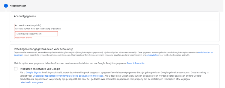 Klik vervolgens rechts op ‘aanmelden’. Je bent nu bij het aanmaken van een Google Analytics account. Vul de volgende informatie juist in:
