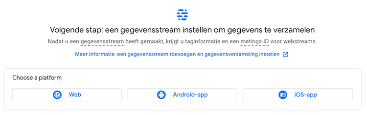 De volgende stap is afhankelijk of je voor Google Analytics, Google Analytics 4 of beide hebt gekozen. Als je voor Google Analytics 4 hebt gekozen, moet je eerst nog een gegevensstream aanmaken.