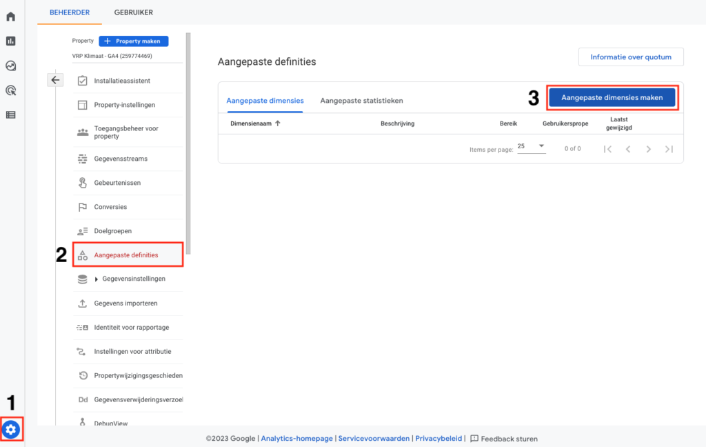 Ga naar beheer, klik op “aangepast definities” en klik vervolgens op “aangepaste dimensie maken”.