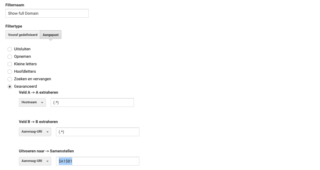 Filternaam: Mag je zelf invullen. Ik maak hier altijd van: Show full domain.