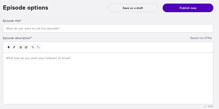 Vul vervolgens de naam, de omschrijving en alle andere informatie van de aflevering in en klik op ‘Publish now’.