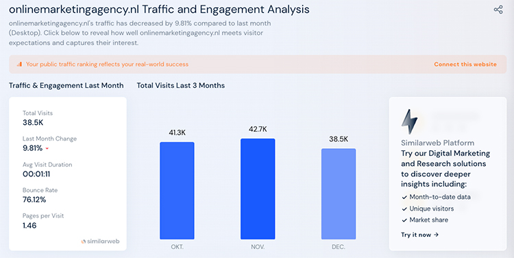 Mocht je nou niet willen betalen voor het achterhalen van de het aantal bezoekers, dan adviseer ik je Similarweb te gebruiken.