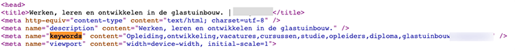 Dit zou het dan makkelijker moeten maken voor zoekmachines om te bepalen op welke woorden je vertoond moet worden. Voor welke keywords jouw pagina relevant is (volgens jou). Deze keywords zien niet zichtbaar voor bezoekers en zijn aan de achterkant (in de broncode) van je website verwerkt.