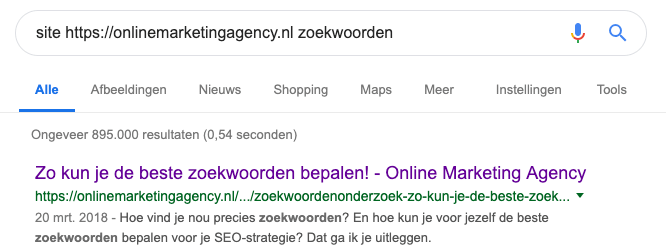 Op die manier geeft Google je alle pagina’s van je eigen website waar gesproken wordt over het onderwerp – en waar je dus mooi een interne link kunt plaatsen.