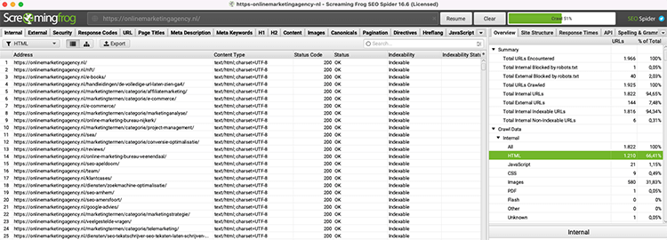 Screaming Frog is een gratis tool die tot 500 URL’s van je website crawlt. Hij zal elke pagina die in je website / sitemap staat analyseren en meenemen.