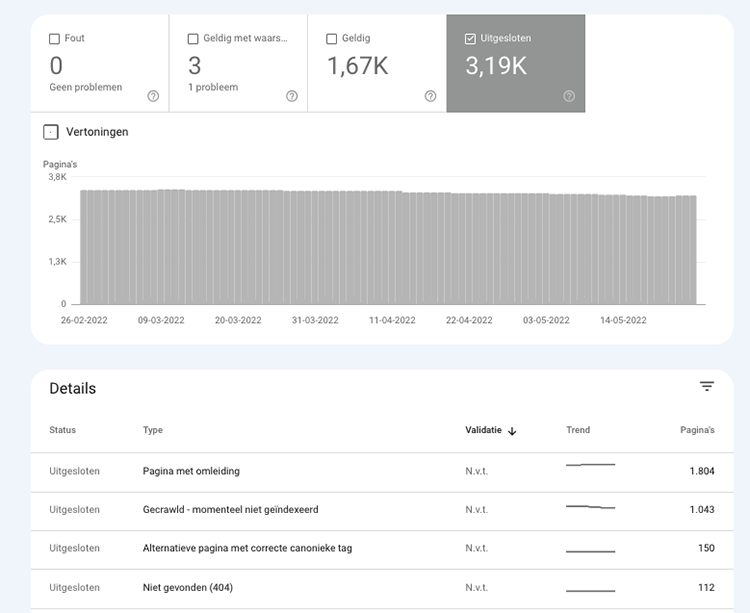 Klik vervolgens op Uitgesloten en ga dan bij het kopje Details op zoek naar de 404’s.