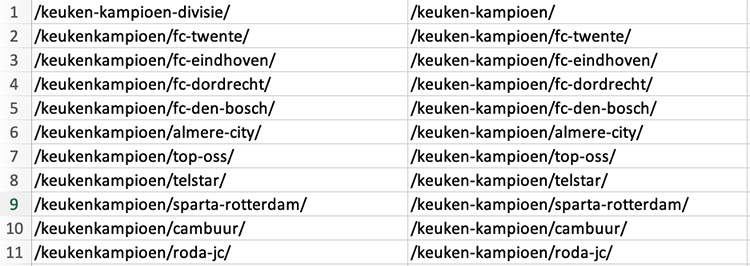 Als het goed is, heb je nu een Excel bestand met daarin in kolom A de oude URL’s en in kolom B de nieuwe URL’s.