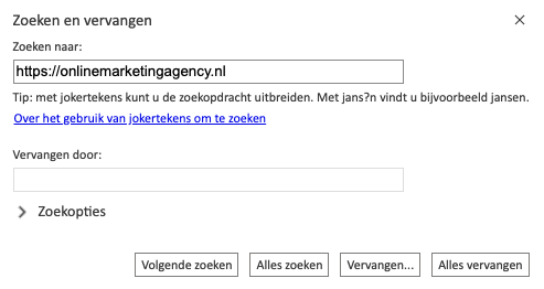 Haal vervolgens met de zoeken-en-vervangen-functie van Excel alle domeinnaam weg door de domeinnaam in te vullen bij zoeken naar en door niks in te vullen bij vervangen. Vervolgens klik je op alles vervangen en je redirect lijst is perfect in orde.