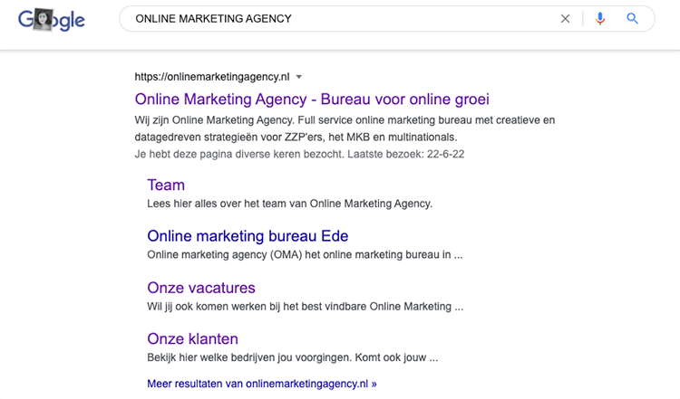 Sitelinks zijn extra link in Google onder je zoekresultaat. Ze zorgen ervoor dat je meer ruimte pakt in de organische zoekresultaat en dus is de kans groter dat iemand op je website klikt.